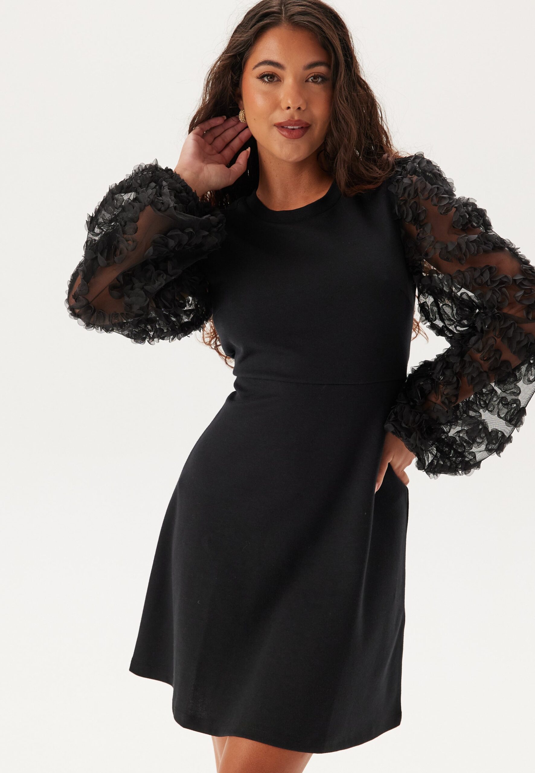 Jerseykjole fra Happy Holly – Elastisk, blød kvalitet – Tætsiddende pasform – Afrundet halsudskæring – Afskæring ved taljen – Detalje – Blonde på ærmerne – Længde fra skulder: 92 cm i størrelse 36/38