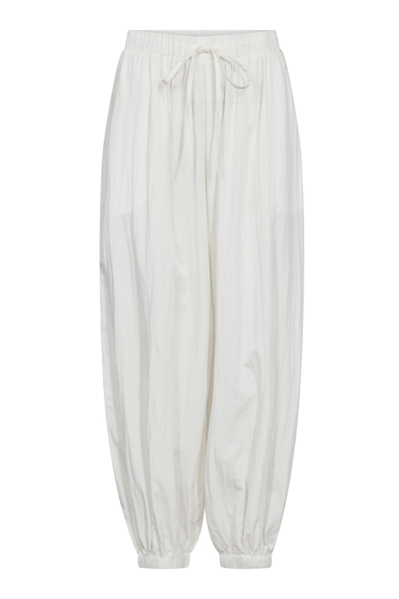 Bukserne her fra A-View på billedet er lette, hvide og luftige med en elegant, boheme-inspireret stil. De har en løs pasform med brede ben, der samles ved anklerne med elastik, hvilket giver et afslappet og samtidig feminint udtryk.Â