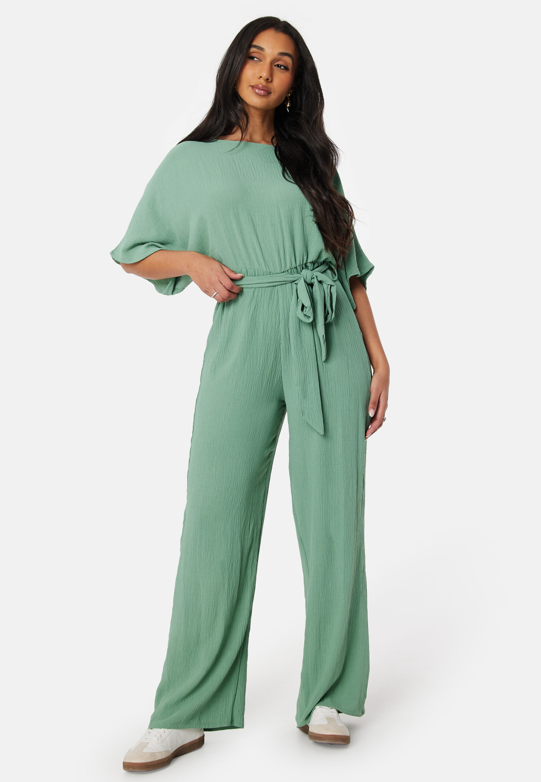 Elegant buksekjole fra BUBBLEROOM. – Blød, vævet kvalitet – Afrundet halsudskæring – Elastik ved taljen med aftageligt bindebånd – Skjult lynlås i ryggen – Bukser med vidde ben – Længde fra skulderen bagpå: 158 cm i størrelse S – Længde ved indersiden af benene: 75 cm i størrelse S Stor i størrelsen