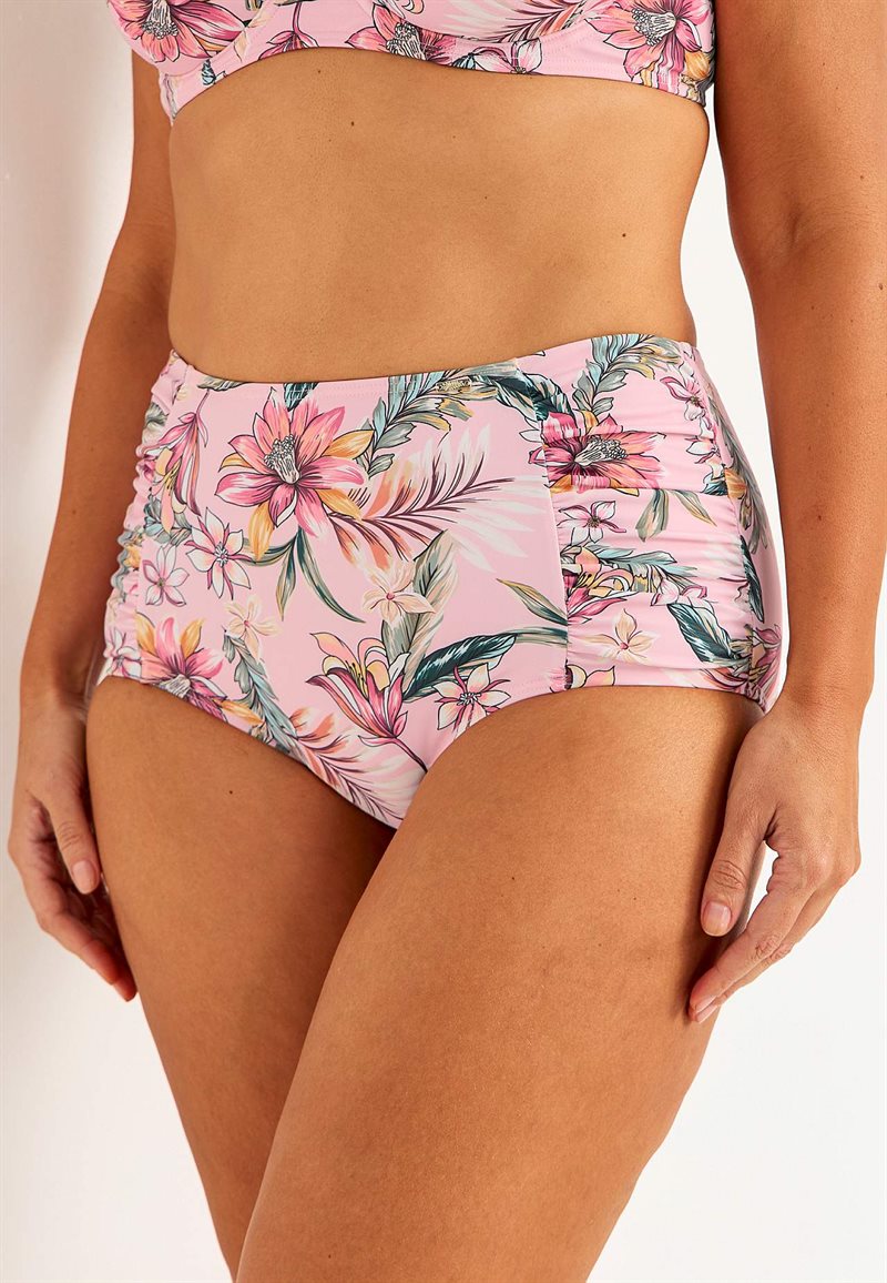 Honolulu bikiniunderdel. • Blomstret bikiniunderdel i genindvundet polyester. • Høj talje. • Dekorativ drapering i siderne. • Tynd, blød elastik ved buksebens- og taljeåbningerne. • Helforet inderside.