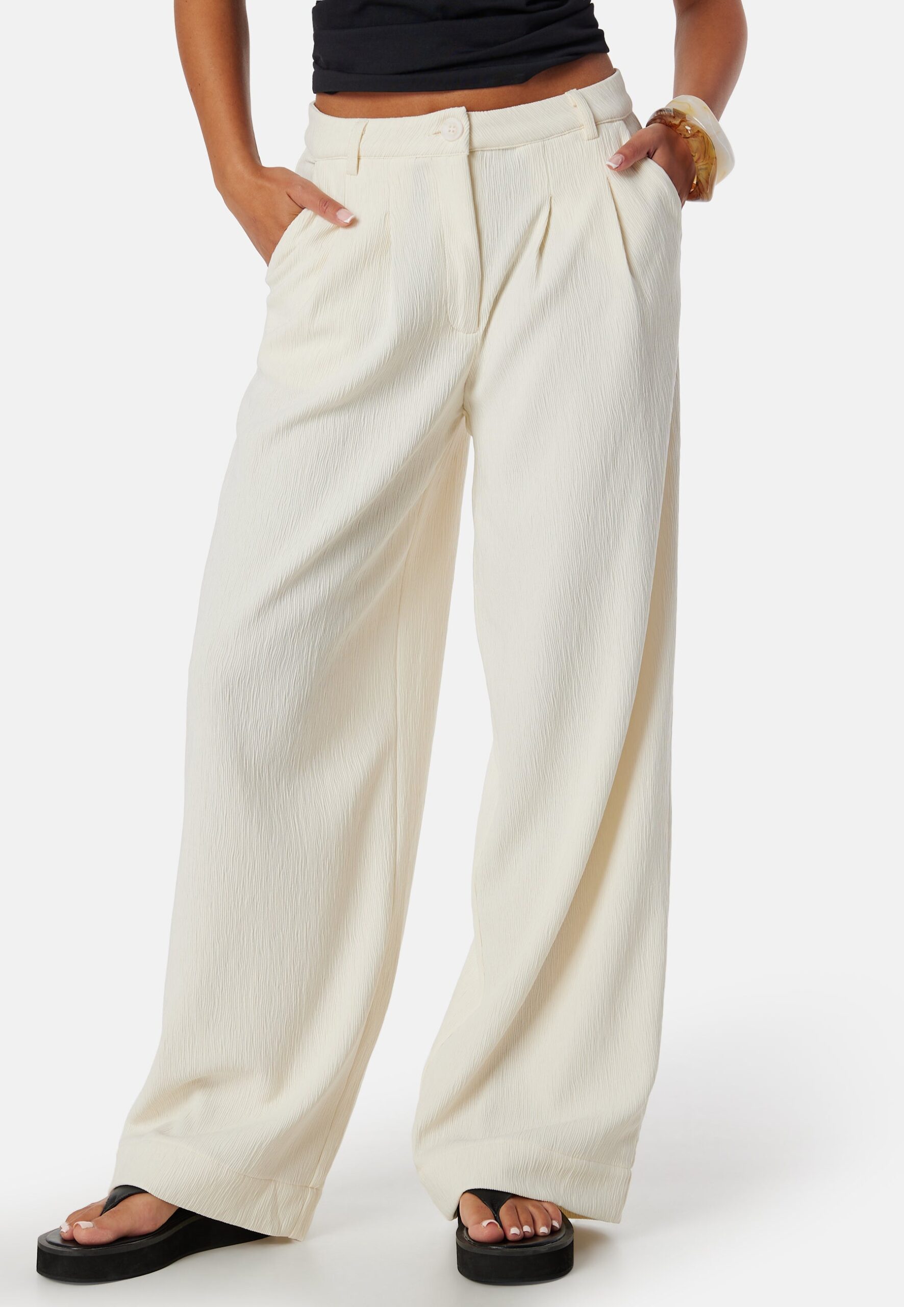 Brede bukser fra Object Collectors Item. – Let elastisk materiale med struktur. – Brede, lige ben. – Gylp med lynlås med knap. – Lommer ved fronten. – De kan kan bæres sammen som et sæt med 720244. – Længde ved indersiden af benene: 80 cm i størrelse 36.