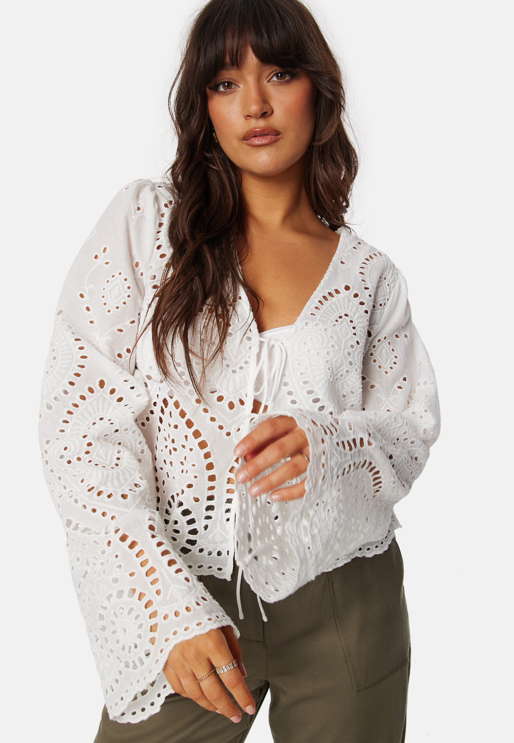 Langærmet bluse fra Object Collectors Item. – Broderie anglaise. – Brede ærmer. – V-udskæring. – Bindebånd ved fronten. – Uforet. – Længde fra foran på skulderen: 55 cm i størrelse 36.