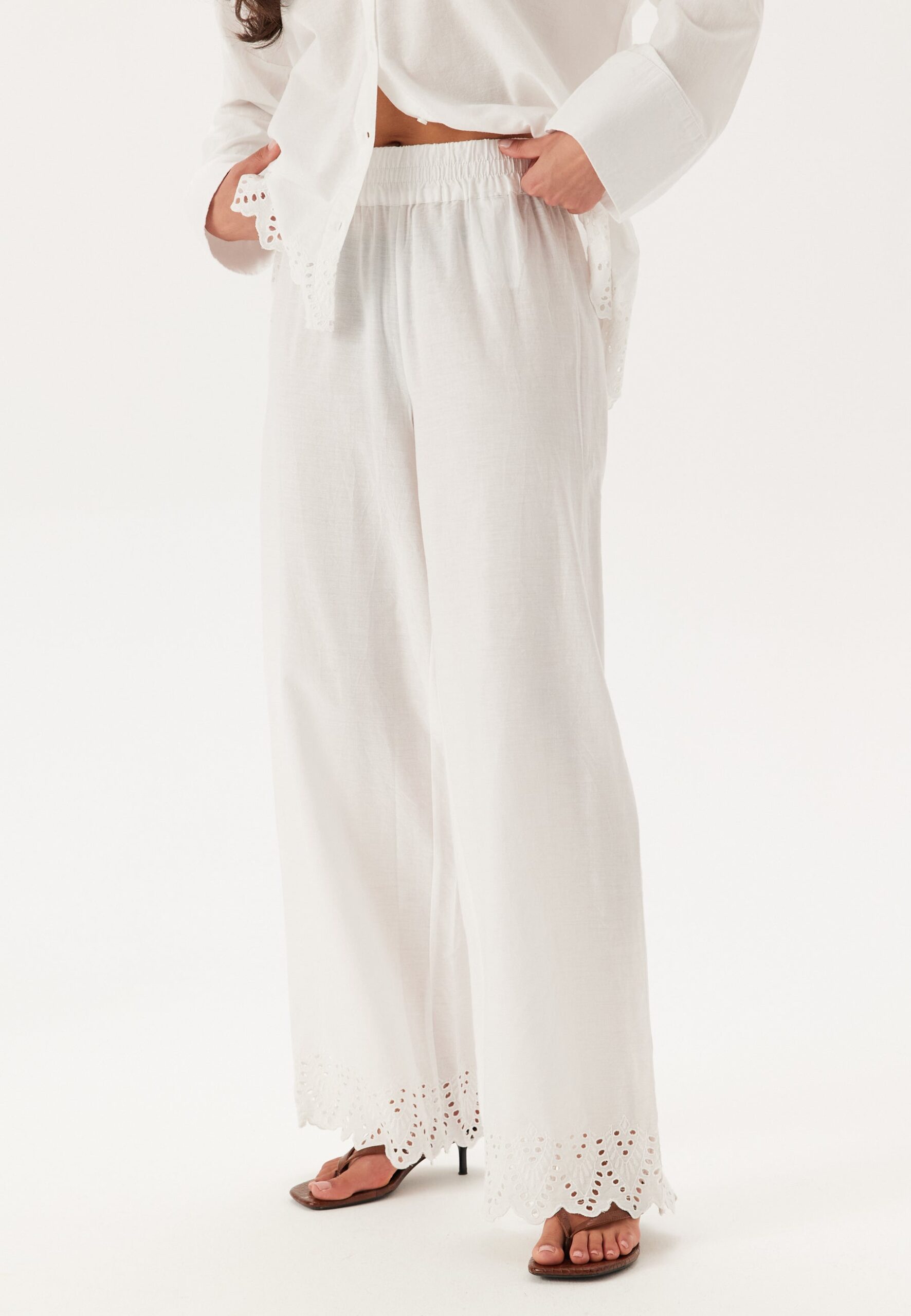 Bukser fra ONLY med hulbroderi. – Vævet materiale uden stræk. – Lige, bred pasform. – Elastik ved taljen. – De kan kan bæres sammen som et sæt med 721940. – Længde ved indersiden af benene: 79 cm i størrelse S/32.