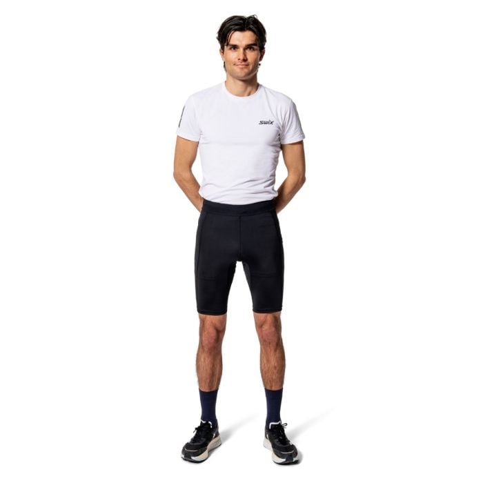 Pace Half Tights er et par tekniske løbetights, der er skabt til både højintensiv træning og længere distancer. Modellen kombinerer superkomfort med 4-vejs stretch og et ekstra elastisk panel i skridtet, hvilket giver optimal bevægelsesfrihed og pasform. De perforerede lycra-paneler bag knæene sørger for ekstra ventilation, og tightsene er udstyret med praktiske lommer – herunder en dedikeret mobillomme på låret og en lynlåslomme i lænden. Refleksdetaljer på låret og logoet sikrer, at du bliver set i mørket.